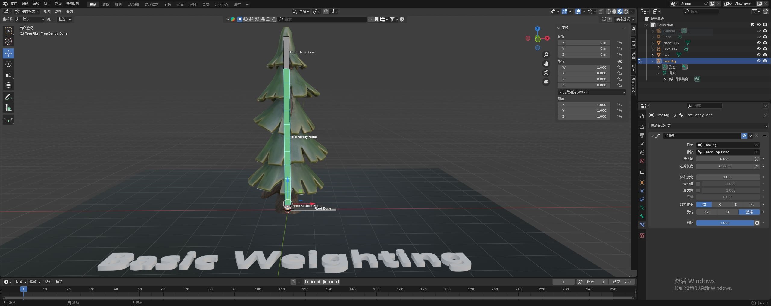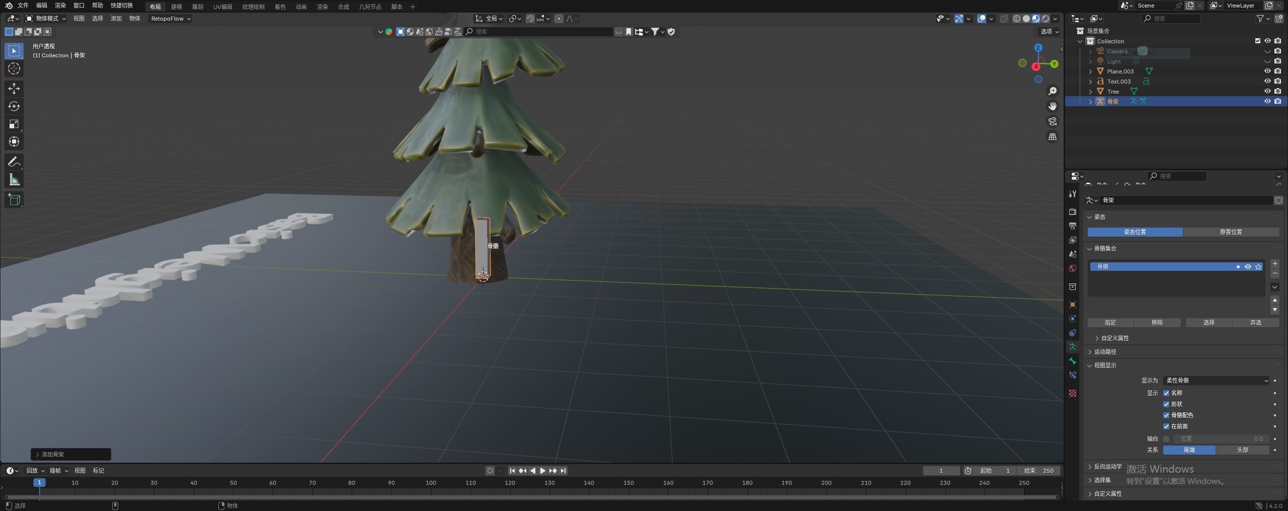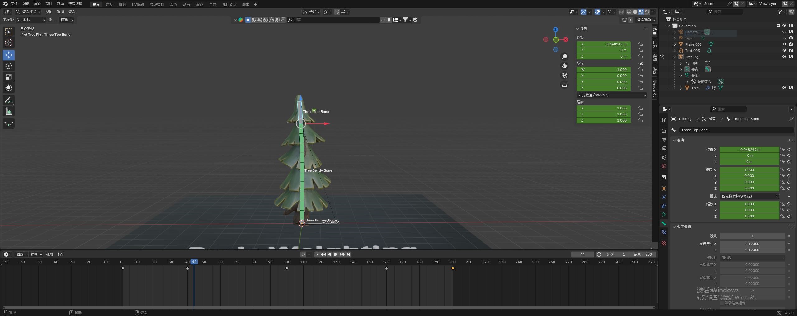 最后我们来到 姿态模式。如下图逐帧调整最上层这根骨骼,树木也会跟着拉伸,边看效果,边调整着添加关键帧。