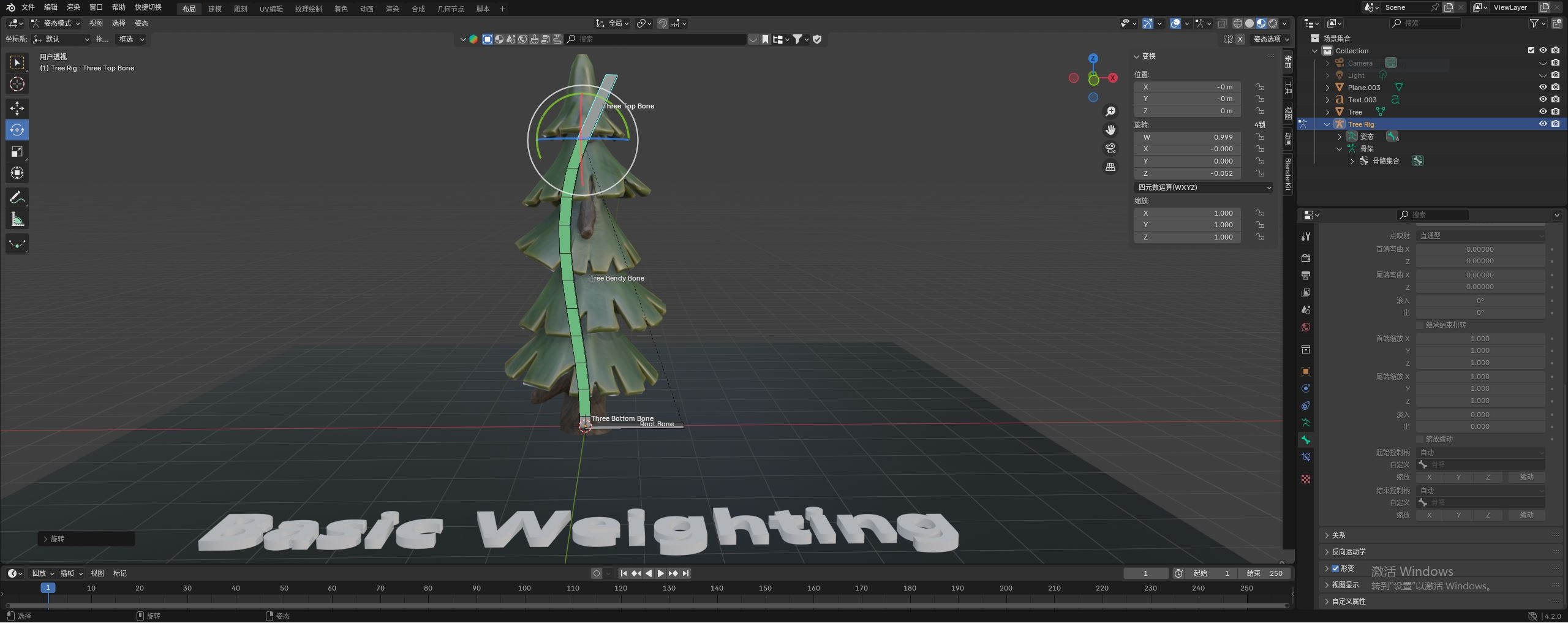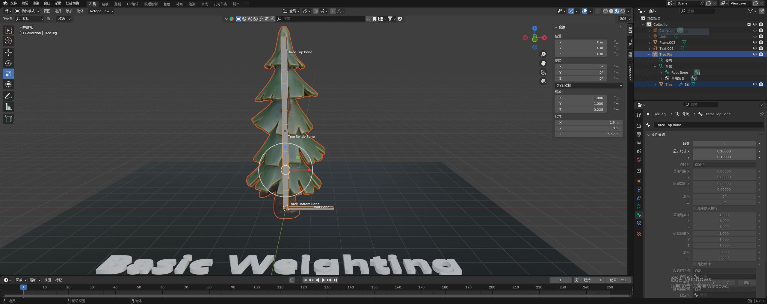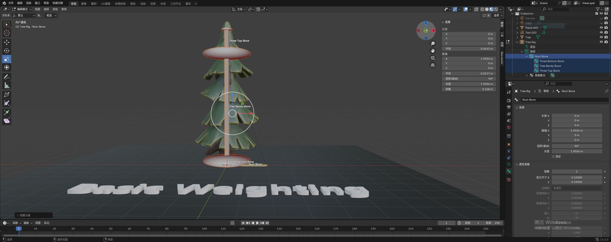 最后我们来到 姿态模式。如下图逐帧调整最上层这根骨骼,树木也会跟着拉伸,边看效果,边调整着添加关键帧。