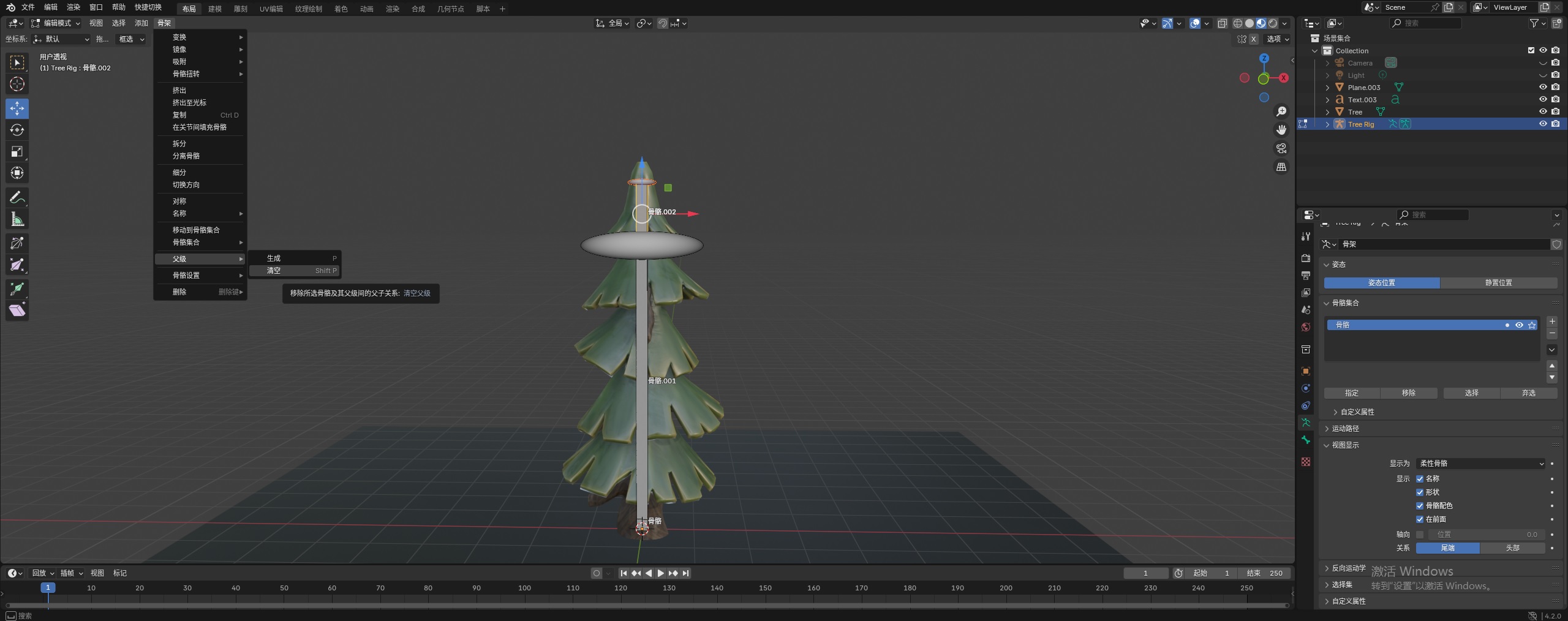 接着来到编辑模式。如下图所示,我们对上一步骤添加的骨骼,向上挤出两次。然后选中最上层骨骼,选择 骨架 / 父级 / 清空,把最长层这根骨骼独立出来。