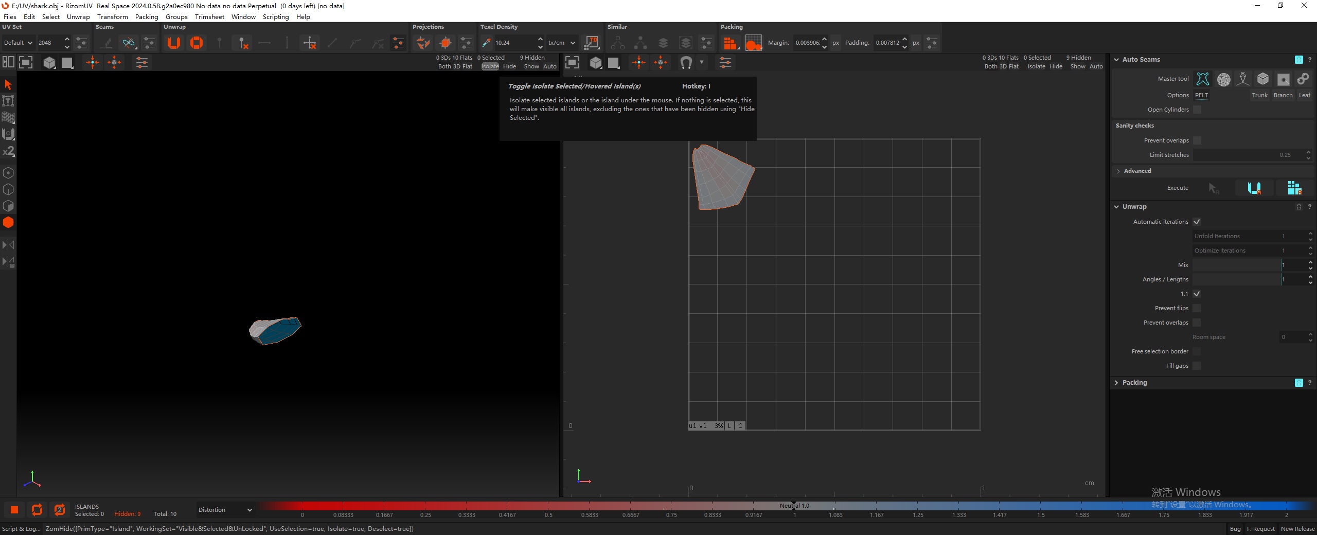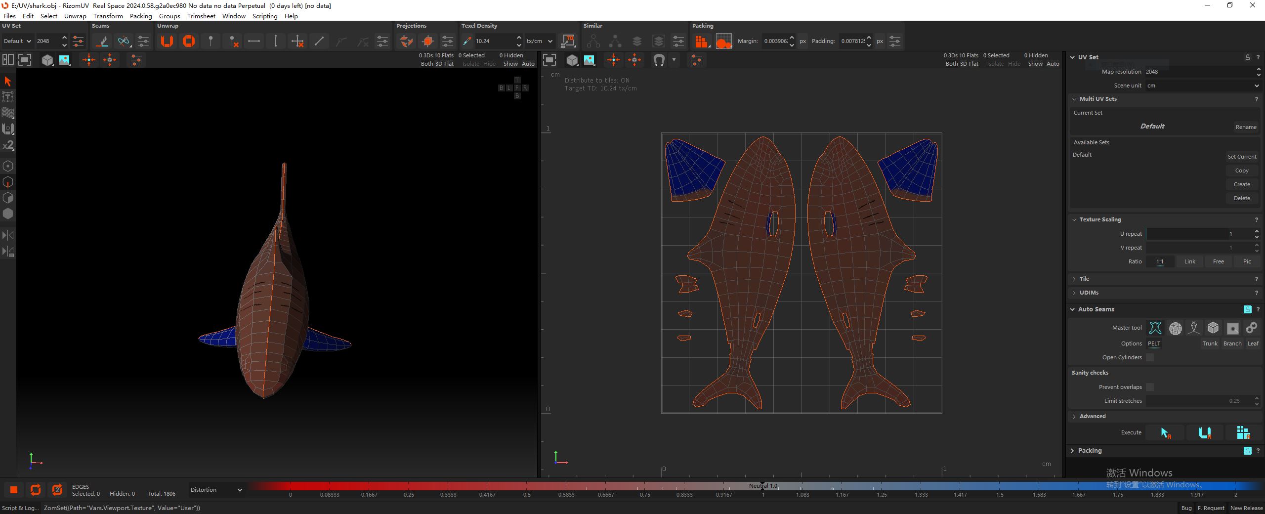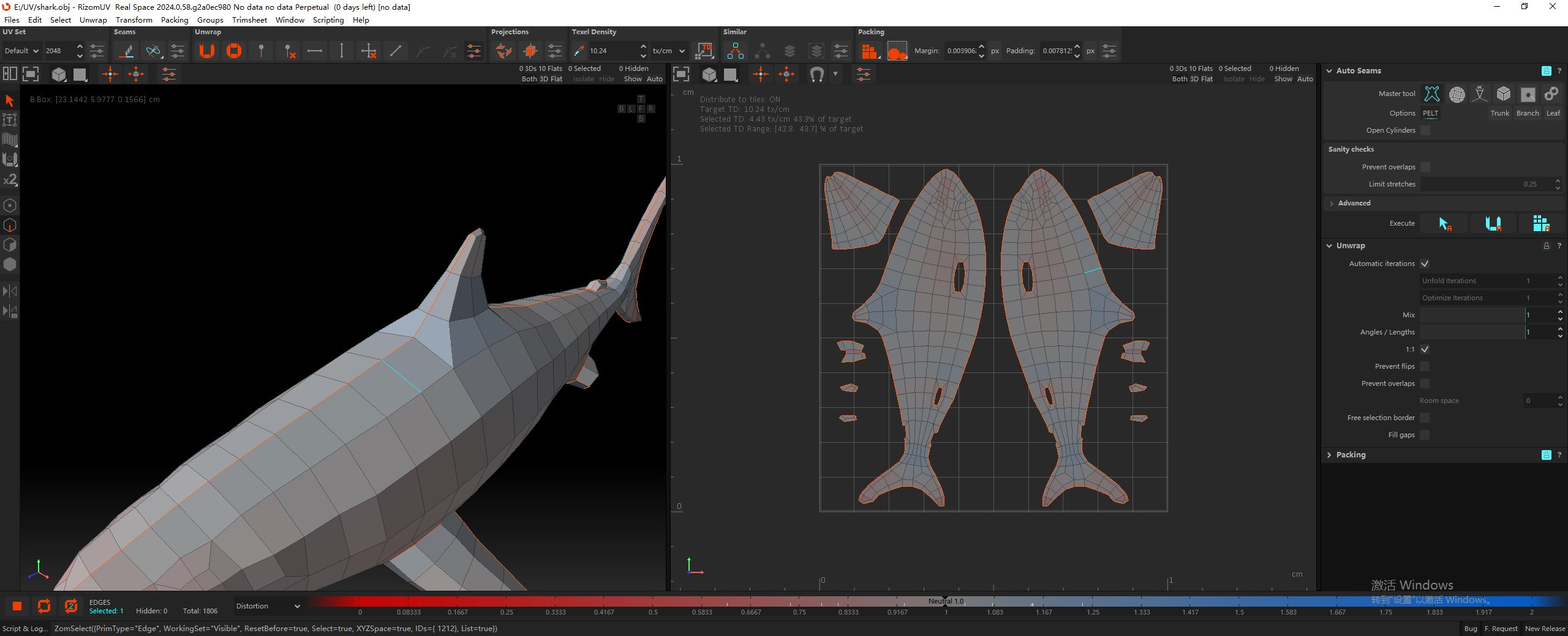 在 RizomUV 中,默认操作模式是边模式。如下图所示,黄色的边是切开的边,青色的边是当前选中的边。