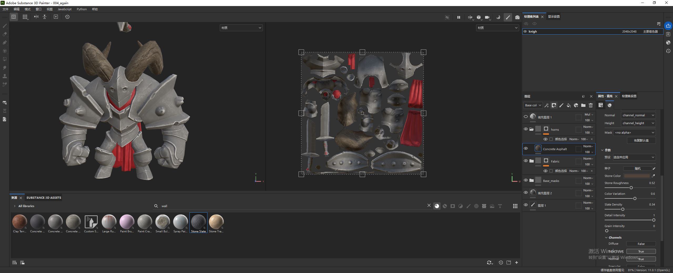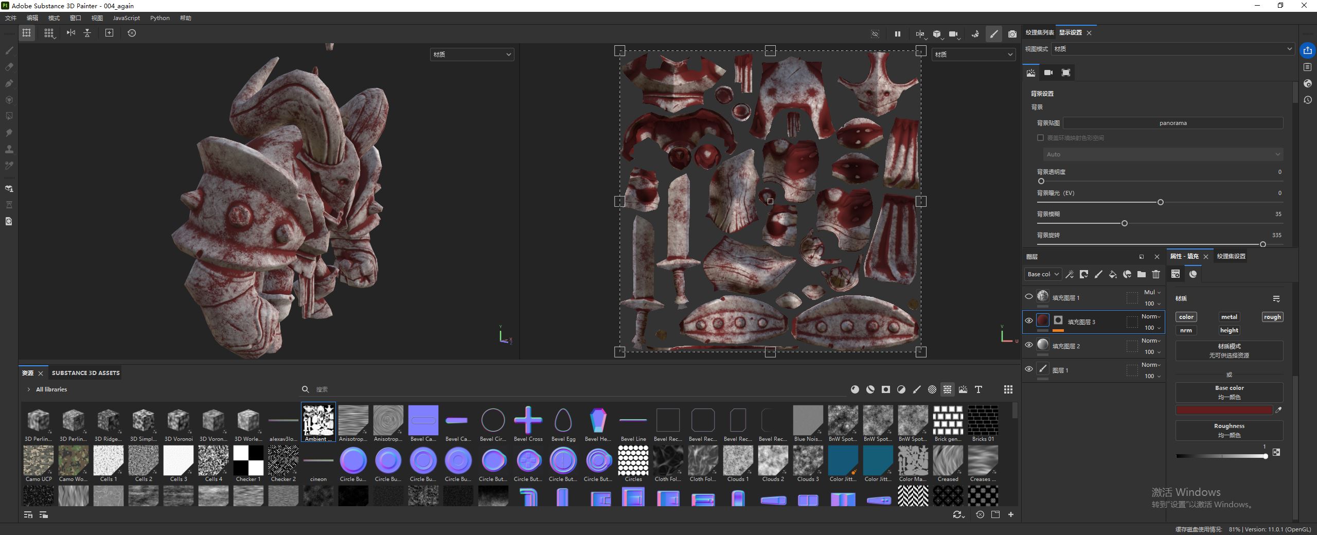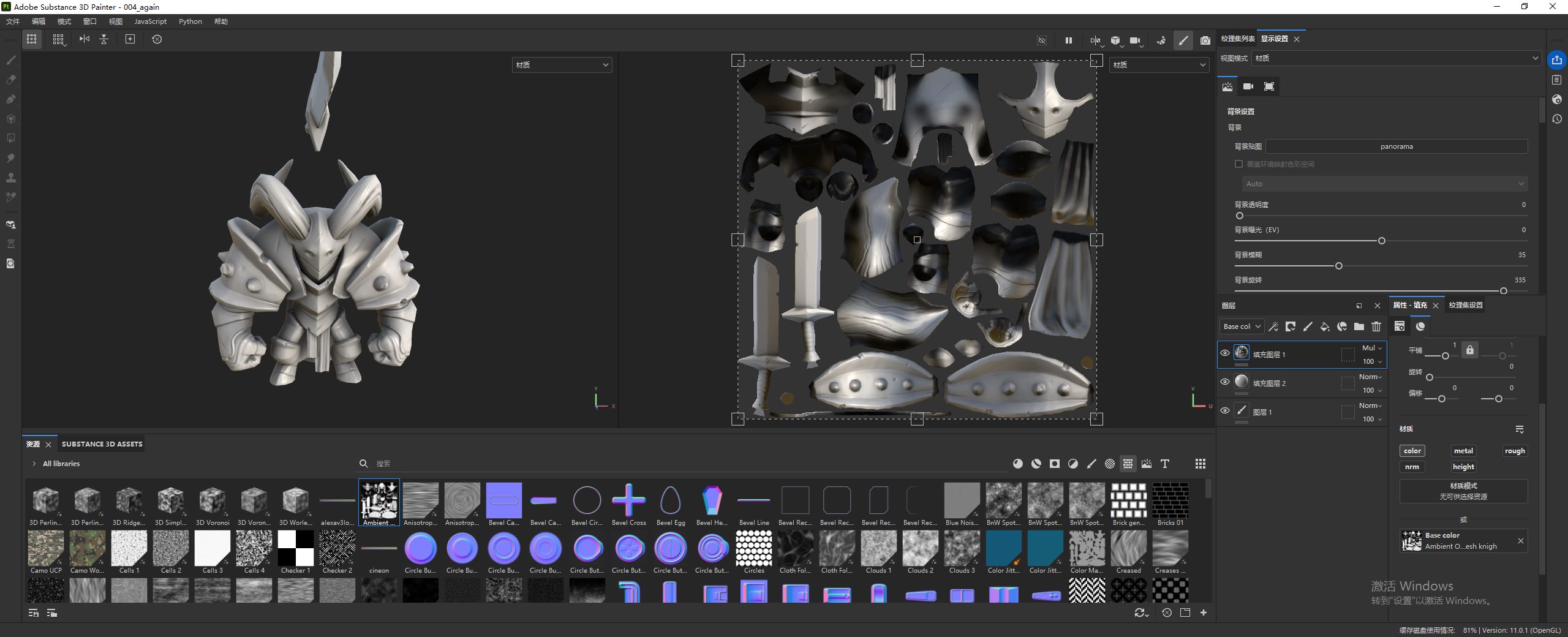 然后在资源面板中,选择纹理,找到生成的环境遮蔽贴图。接着拖拽到填充图层属性面板中的 Base color。