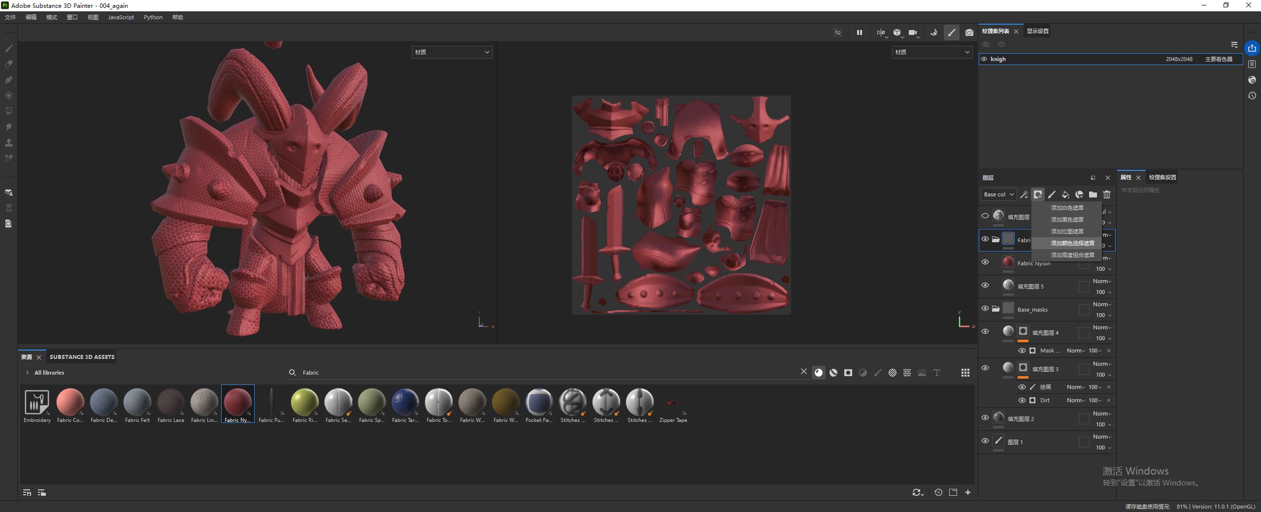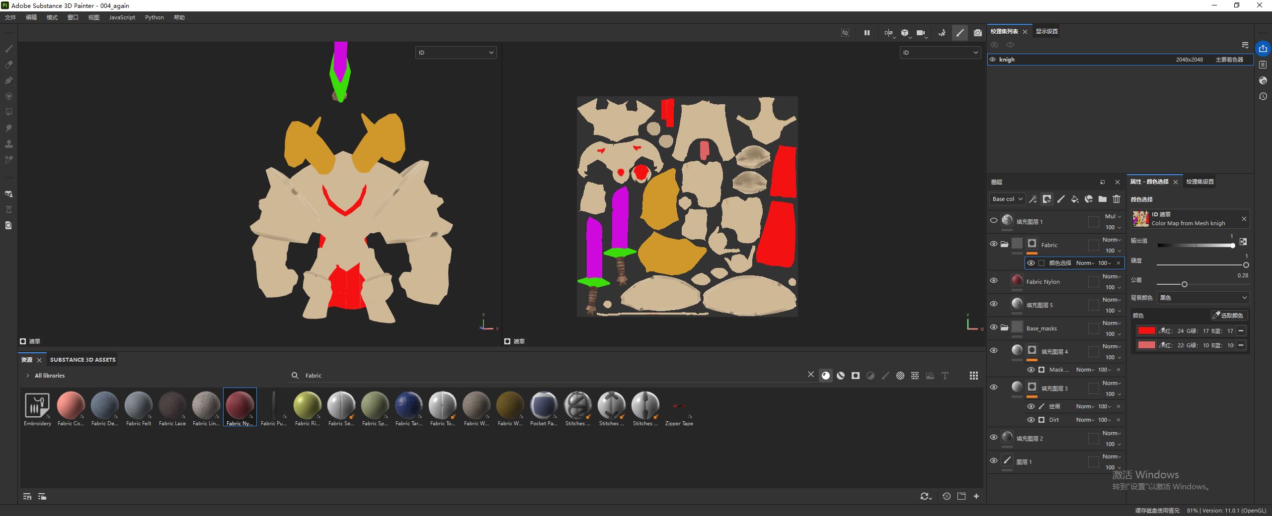从下方图片中可以看到,添加的材质作用到了整个模型,我们需要它只作用于披风。为此我们可以 添加颜色选择遮罩。