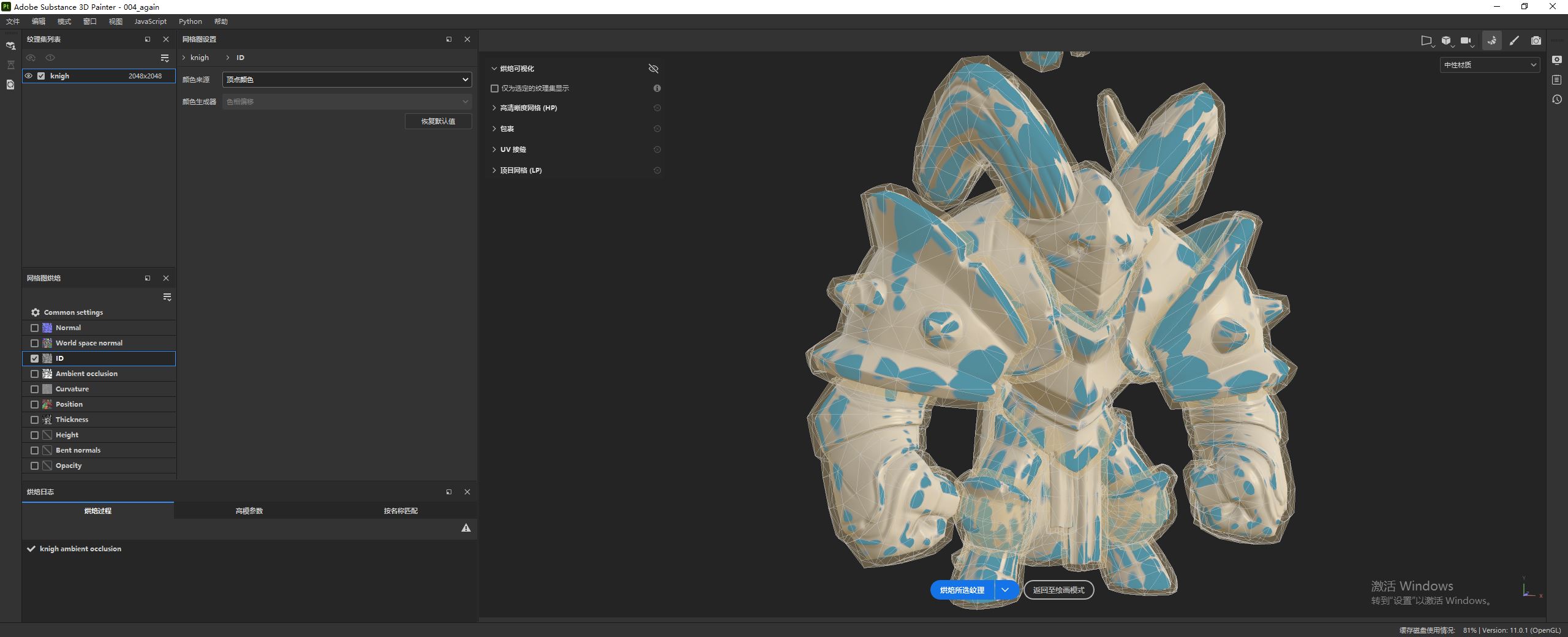 如下图所示,我们在纹理集设置面板中,点击烘焙网格贴图,进入烘焙窗口。